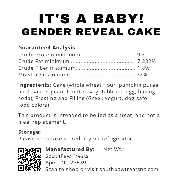 Perfect for celebrating the upcoming arrival of a new family member, this 3-layer 4” cake can reveal whether the baby is a boy or a girl with a fun, colorful surprise inside. Made from 100% human-grade ingredients, it's a guilt-free indulgence for your pup.